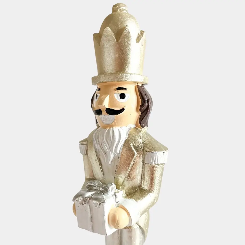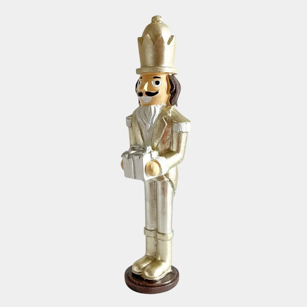 Figurină decorativă Spargător de Nuci în nuanțe elegante de auriu și alb, realizată din rășină de calitate superioară. Înălțime 21,5 cm – ideală pentru decoruri festive, cadouri elegante sau aranjamente de Crăciun. Adaugă un accent regal și strălucitor oricărui decor de sezon.